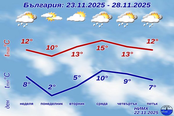 През първите дни от новата седмица вероятността за валежи е малка. След студената сутрин с минимални температури в много райони близки до нулата, в понеделник през деня вятърът ще се ориентира от юг-югозапад и с него бързо ще се затопли, още във вторник температурите отново ще станат по-високи от обичайните за края на ноември.